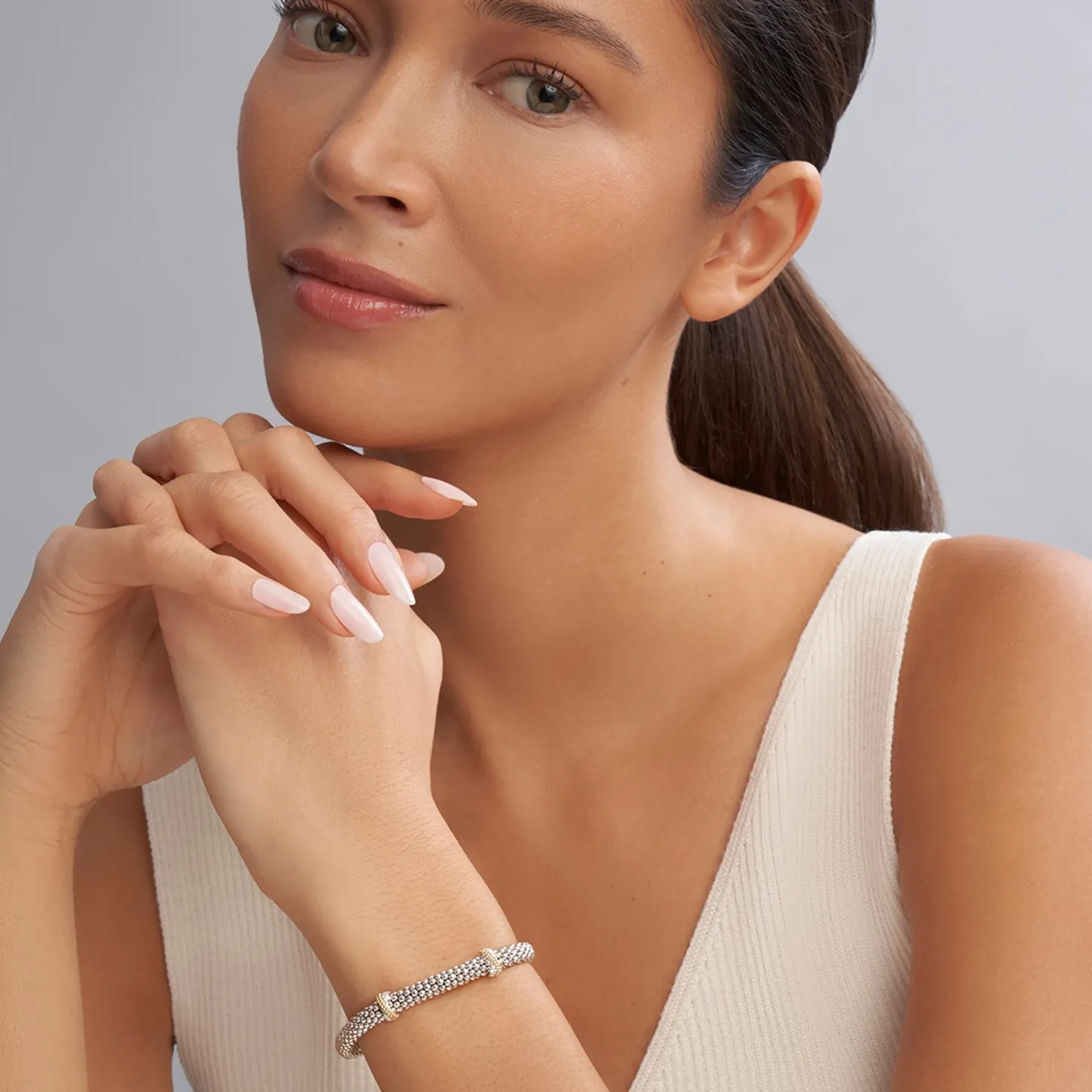 Sterling Silver Caviar Beading Accented By Two 18K Gold And Diamond Stations Form This Detailed Lagos Bracelet. Lagos Diamonds Are The Highest Quality Natural Stones.