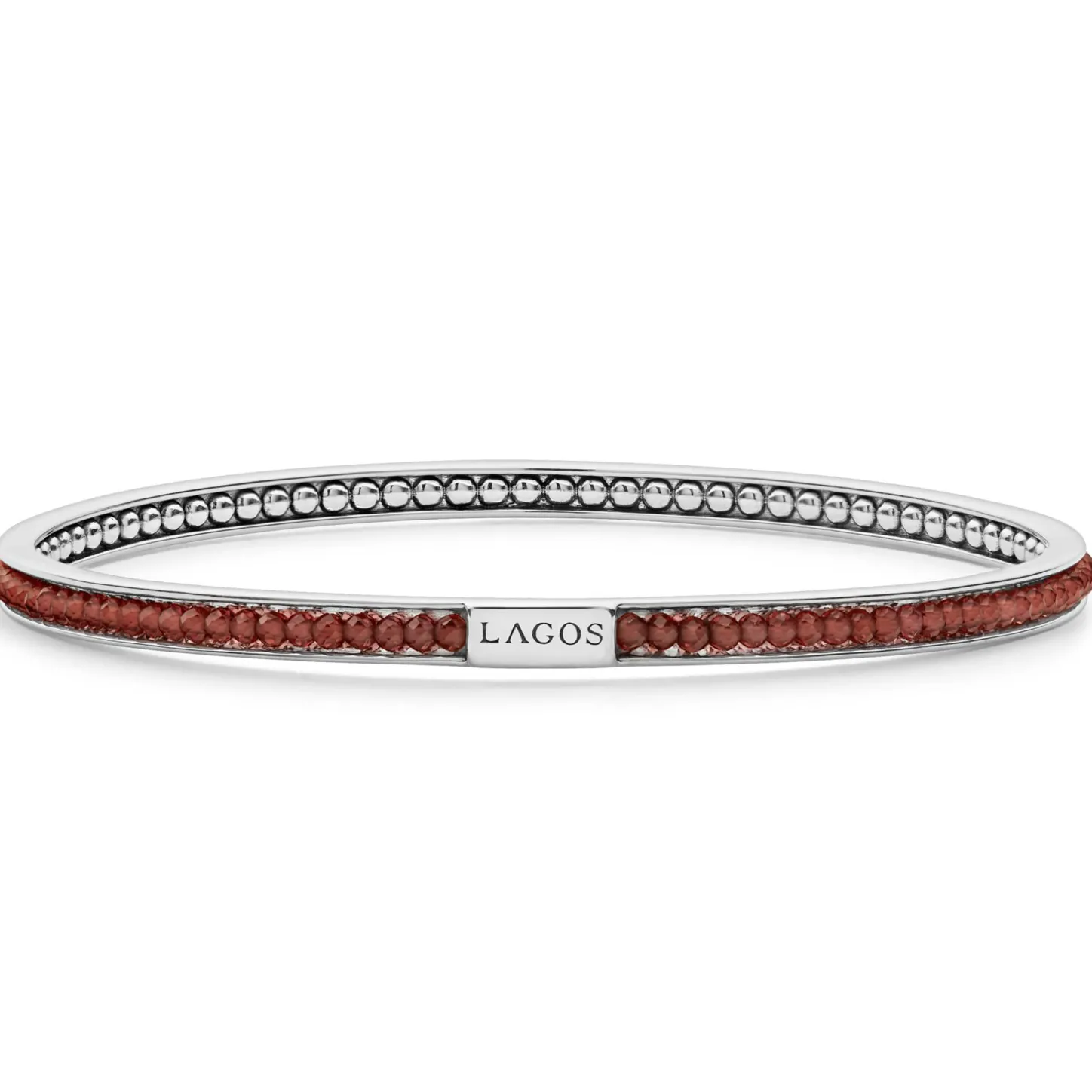 Garnet Gemstones Set With Smoothly Polished Sterling Silver Forms This Round Bangle Detailing The Lagos Logo.