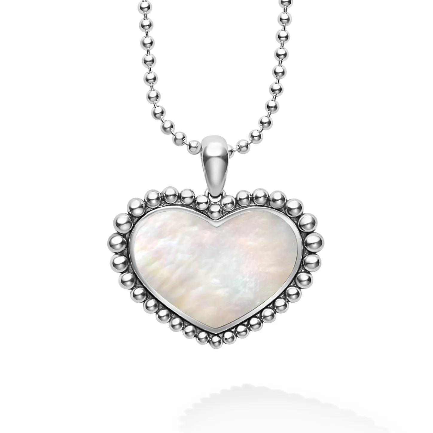 A White Mother Of Pearl Gemstone Pendant Framed By Sterling Silver Caviar Beading In The Shape Of A Heart Finished On A Ball Chain Necklace.