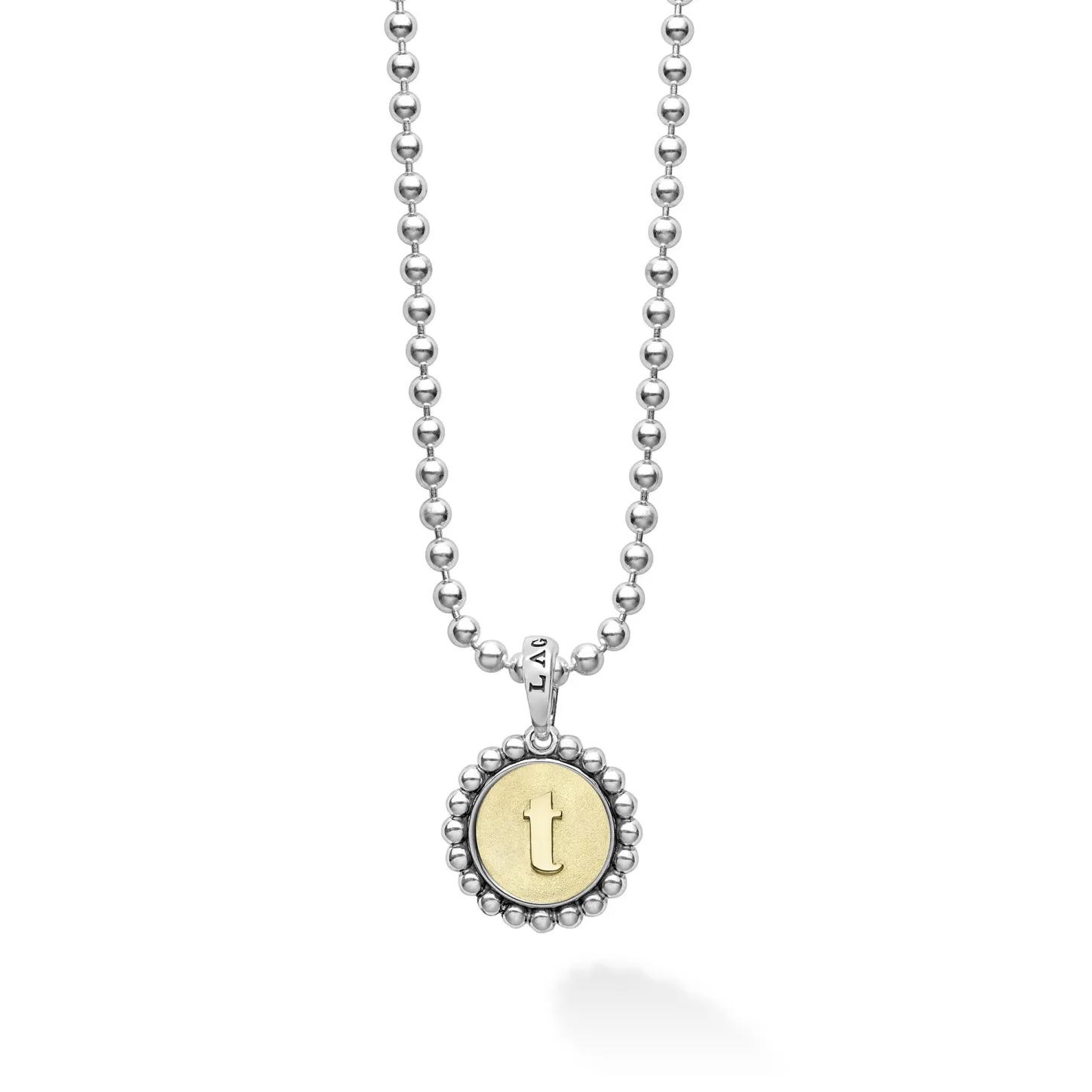 Our Signature Caviar Sterling Silver And 18K Gold Initial ‘T’ Charm Finished On A Sterling Silver Ball Chain Necklace.