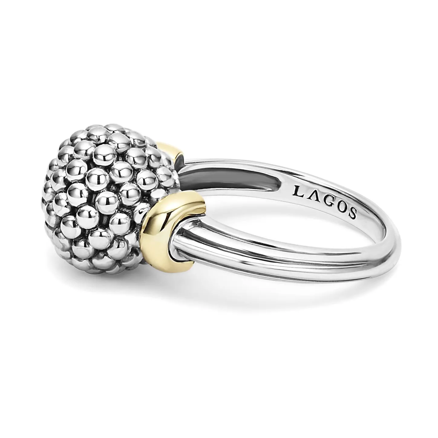 Sterling Silver Caviar Beaded Ring With A Fluted Band And 18K Gold Details.