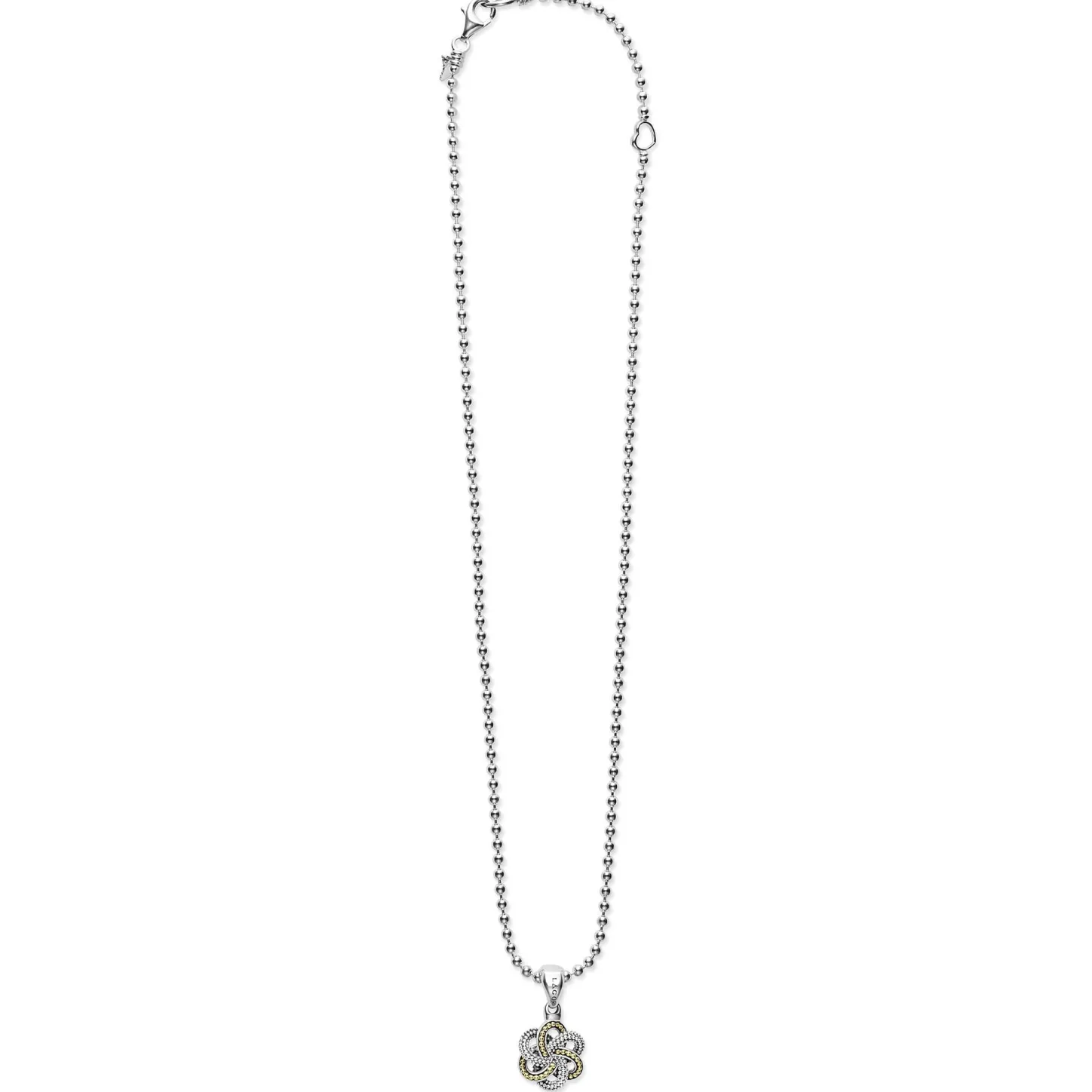 - One Small 18K Gold And Sterling Silver Caviar Beaded Love Knot Pendant Finished On An Adjustable 16 To 18 Inch Ball Chain Necklace
