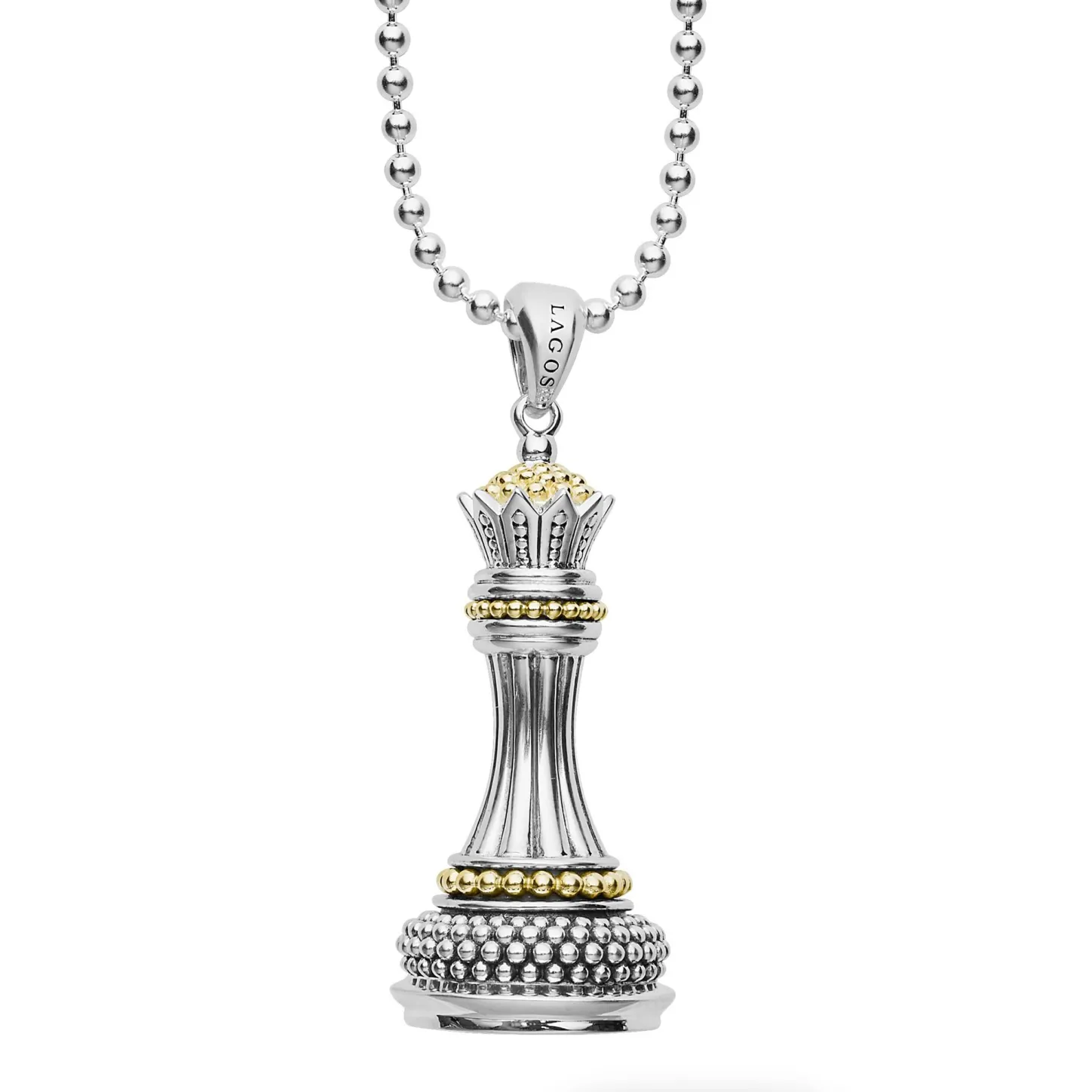 A Lagos Exclusive. Beautifully Crafted Sterling Silver And 18K Gold Queen Chess Piece Finished On A 34 Inch Ball Chain Necklace.
